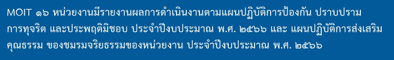 1.2 รายงานผลการดำเนินงานตามแผนปฏิบัติการป้องกัน ปราบปรามการทุจริต และประพฤติมิชอบของหน่วยงาน ประจำปีงบประมาณ พ.ศ. 2566 รอบ?12 เดือน (1 เมษายน2565-30?กันยายน 2566) หน่วยงานต้องนำ link วางในระบบ MITAS อย่างช้า ภายในวันที่ 14 กันยายน?2566